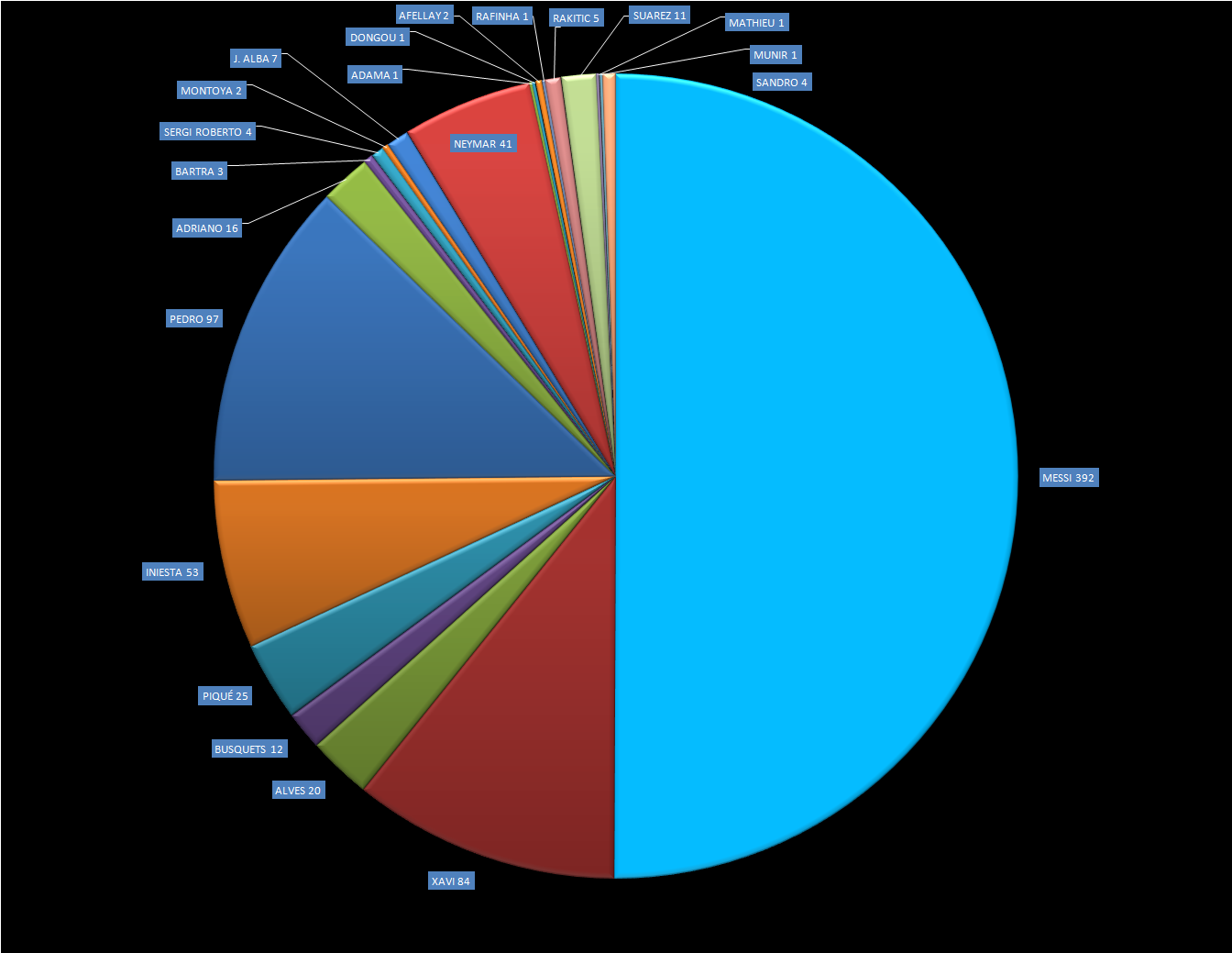 Another interesting number about Messi is the number of goals he has scored for the club compared to the rest of his teammates. This graph was made before the match, but doesn’t really change after the win over Vallecano. Messi now has 395 goals in his Barcelona career. The rest of his teammates combined? They have 394. Messi also needed just 11 minutes for this hat trick, the quickest of his career. In 2015, he has 18 goals and 9 assists in 16 matches.